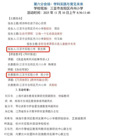 第七届全国中小学(幼儿园)品质课程学术交流会将于2025年11月8日至11日在三亚盛大启幕。本次会议以“活跃学习生态的课程变革”为主题,聚焦课程品质提升与学生核心素养培育,汇聚全国教育专家、学者与一线教师千余人,共绘基础教育高质量发展新蓝图。其中,三亚市实验小学将在丹州小学分会场进行报告分享与课例展示,展现学校课程建设成果。活动议程安排——