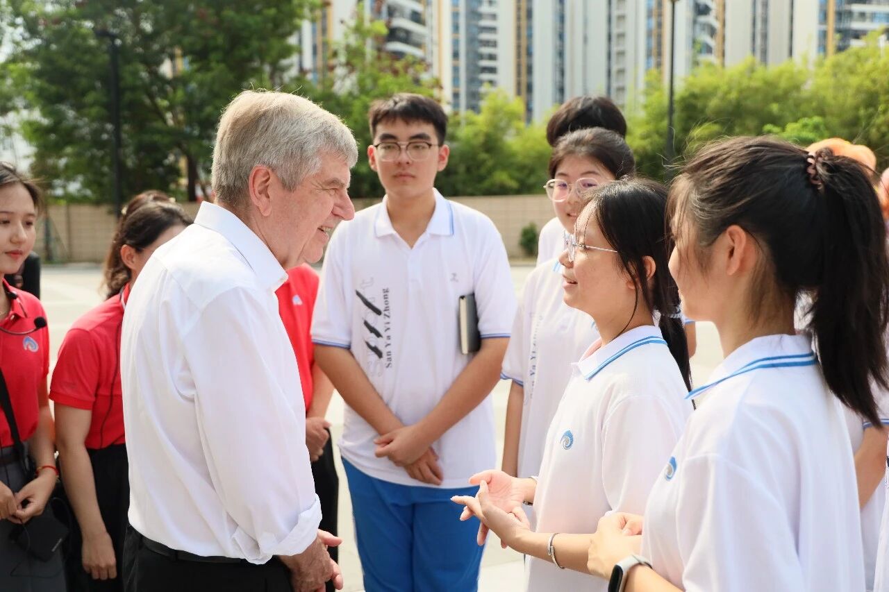 巴赫热情地与学生代表互动交流,赠送奥林匹克纪念品,对学校将优秀传统文化与体育教学深度融合的实践给予高度赞许,并寄语青少年要坚持运动、锤炼品格、享受团队协作。