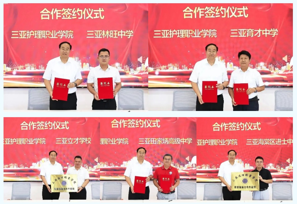 三亚护理职业学院与海棠区进士中学、海棠区林旺中学、育才生态区立才学校、育才生态区育才中学、崖州区田家炳高级中学等五所试点中学签署职普融通协议并授牌