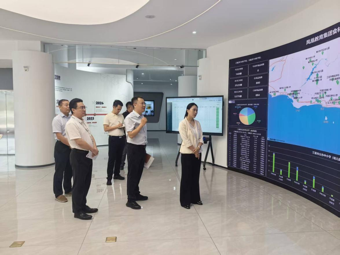 调研组一行实地观看凤凰教育集团食材配送基地数据中心演示,详细了解平台配送调度、营养菜单定制、车辆动态监控等数字化管理功能,深入各核心区域,实地调研食材采购、验收、加工、存储、配送全流程运转情况,重点询问企业在落实食品安全主体责任、规范集采集供流程、排查廉政风险隐患等方面的具体举措,细致核查企业溯源体系建设、质量管控落实等工作的实际成效。随后,调研组以“四不两直”方式深入三亚市民族中学督导检查食材存储、明厨亮灶及家长陪餐制等工作,并陪同学生用餐。