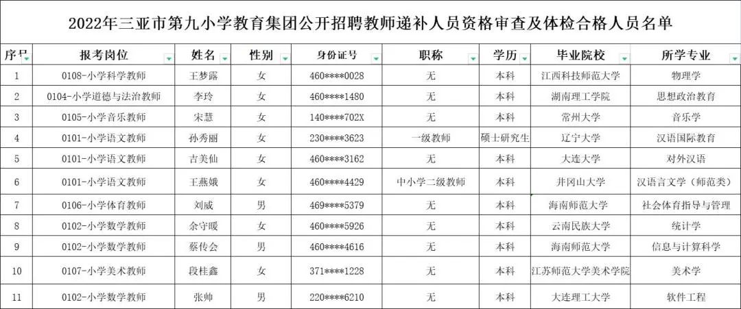 2022年三亚市第九小学教育集团公开招聘教师递补人员资格审查及体检合格人员名单如下图。