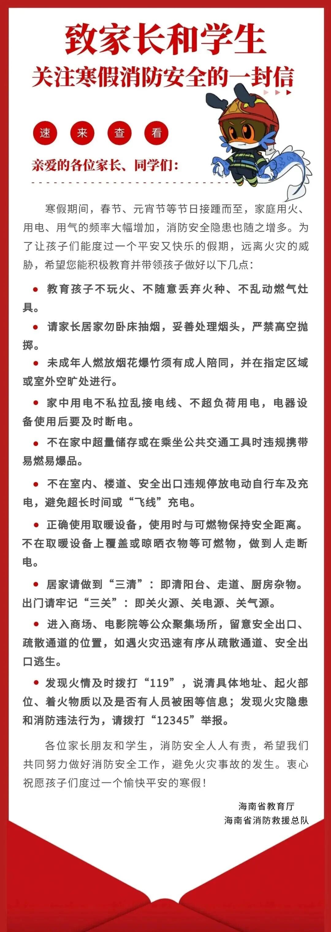 致家长和学生关注寒假消防安全的一封信