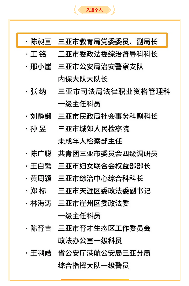 近日,中共海南省委政法委员会印发《关于表彰海南省未成年人护苗专项行动先进集体和先进个人的通报》,三亚9个集体和13名个人荣获海南省未成年人护苗专项行动先进称号。