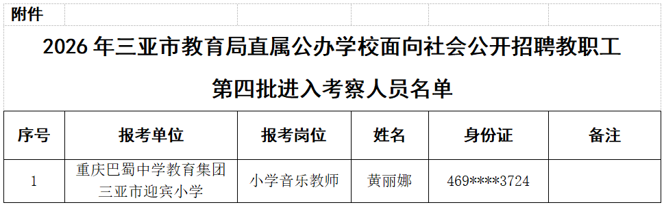 2026年三亚市教育局直属公办学校面向社会公开招聘教职工体检工作已结束,现将第四批进入考察人员名单予以公示(详见附件)。