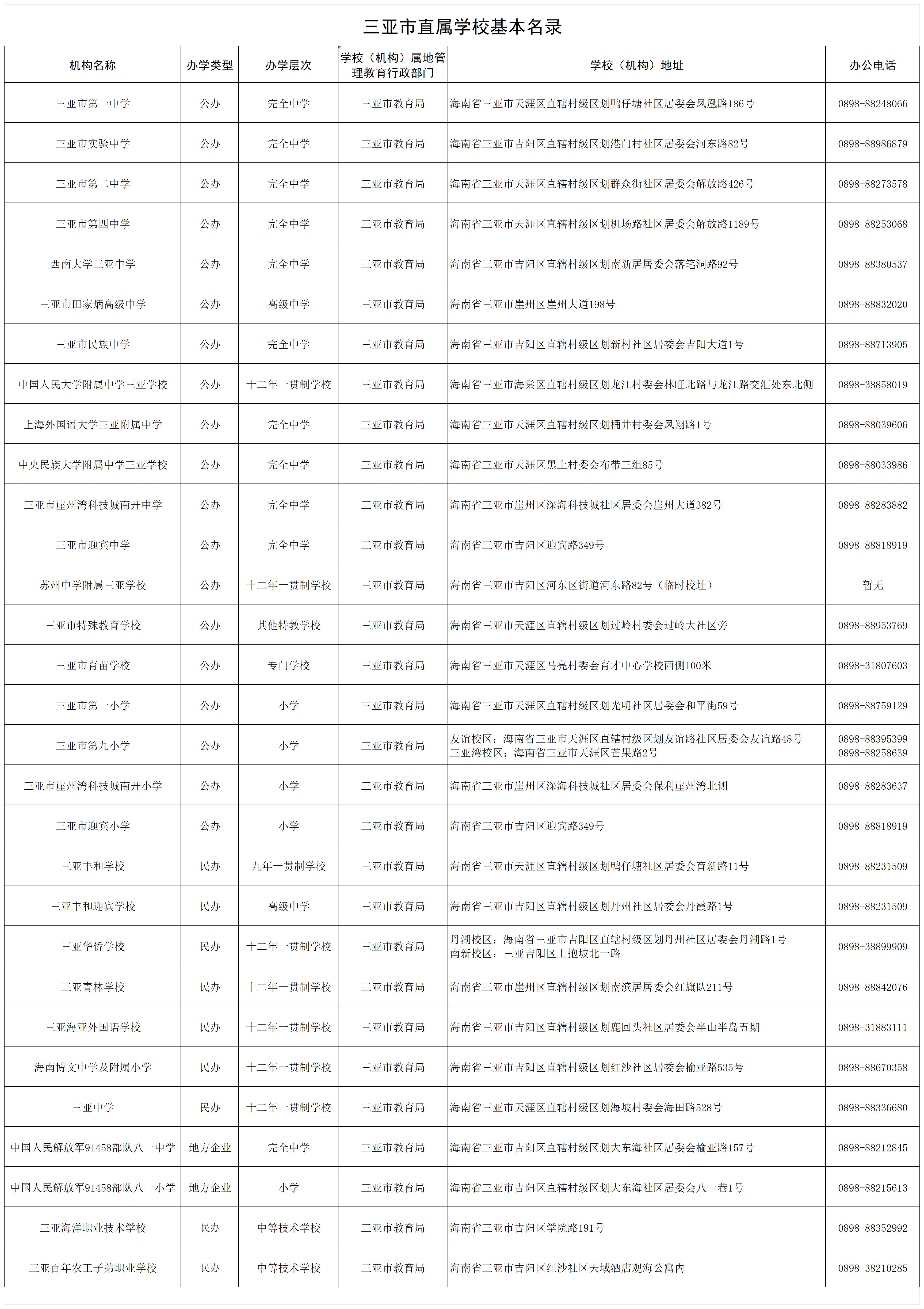 三亚市直属学校基本名录